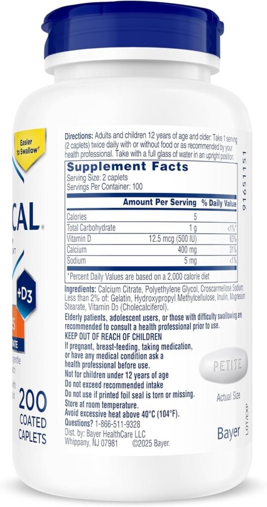 Este es el suplemento “Citracal Petites“, un producto de la marca Bayer diseñado para el apoyo de la salud ósea. Se presenta en un frasco que contiene 200 capletas recubiertas (“coated caplets”).